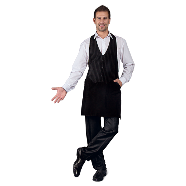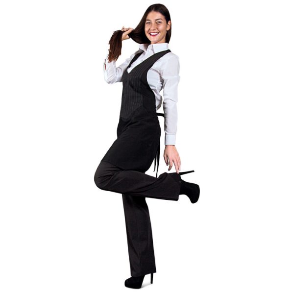 ‘- Ženska konobarska pregača crne boje sa plastronom u obliku konobarskog prsluka;